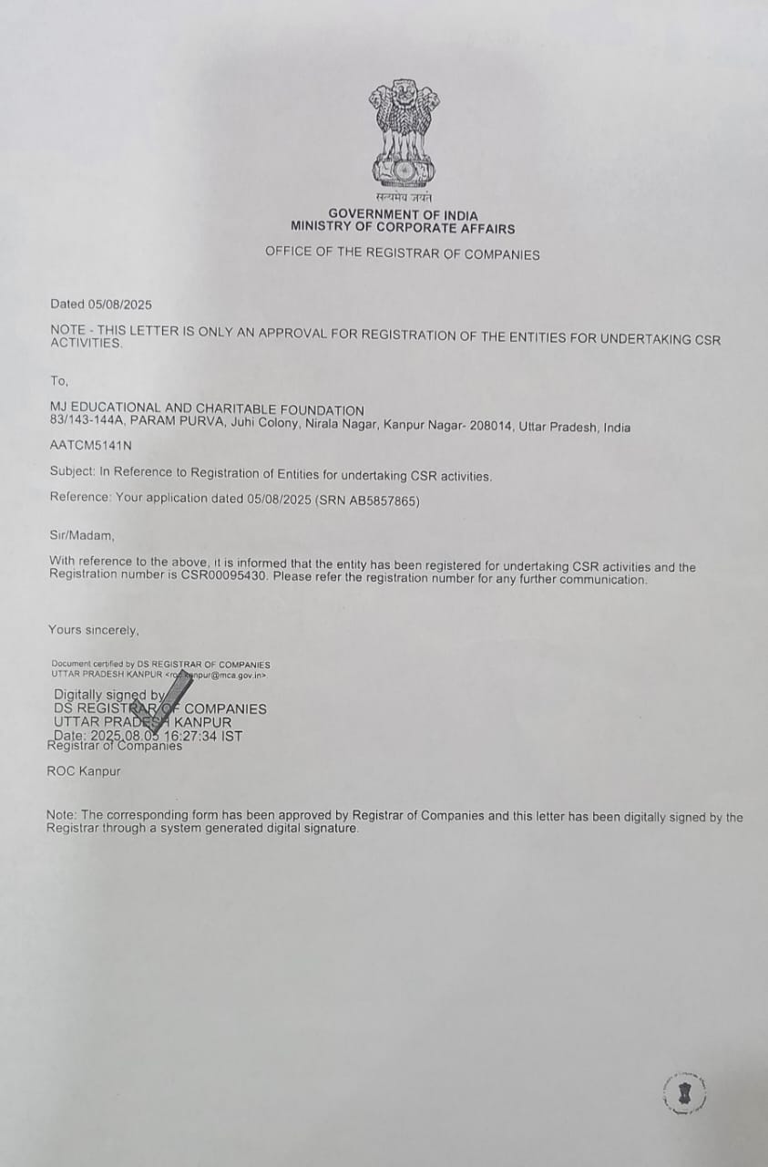 MJ Educational and Charitable Foundation is incorporated as a Section 8 Company under the Companies Act, 2013. We believe that education is the key to breaking the cycle of poverty and creating a brighter future for all. Our foundation was established with a simple but powerful vision: to empower individuals and uplift communities through education, mentorship, and compassion.